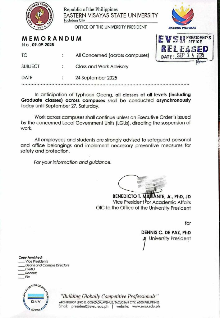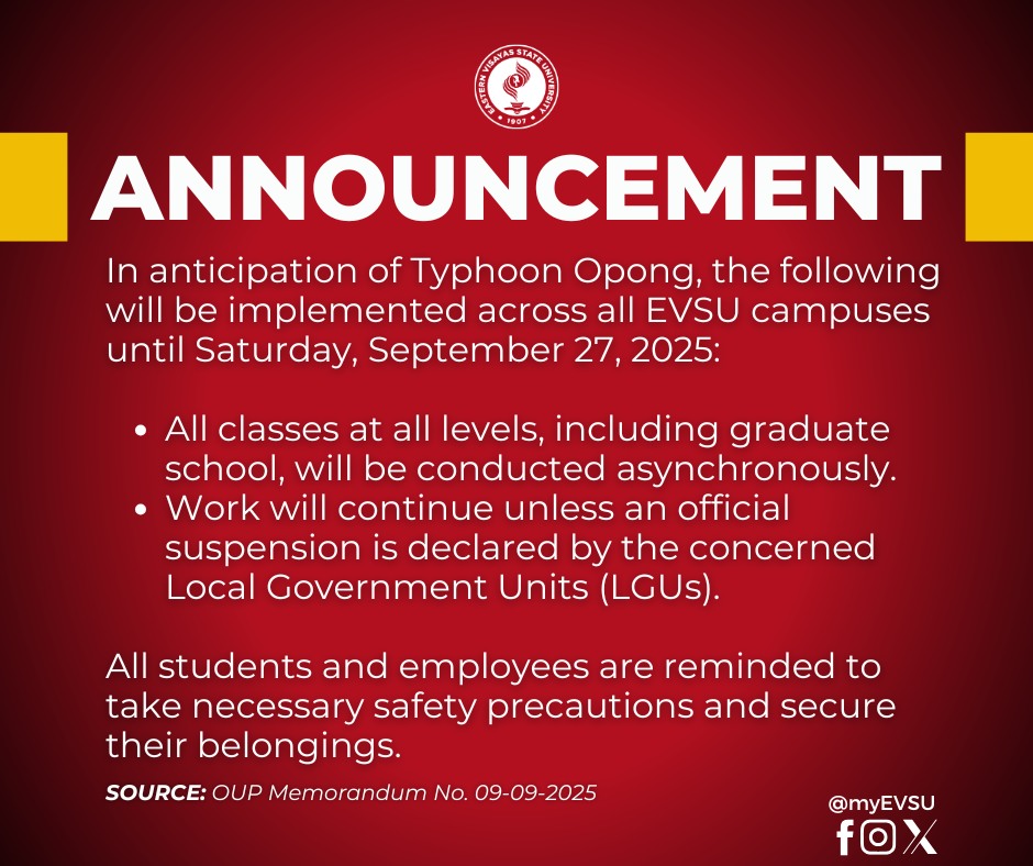 In anticipation of Typhoon Opong, all classes across all campuses will be held asynchronously from today, September 24, to Saturday, September 27, 2025.