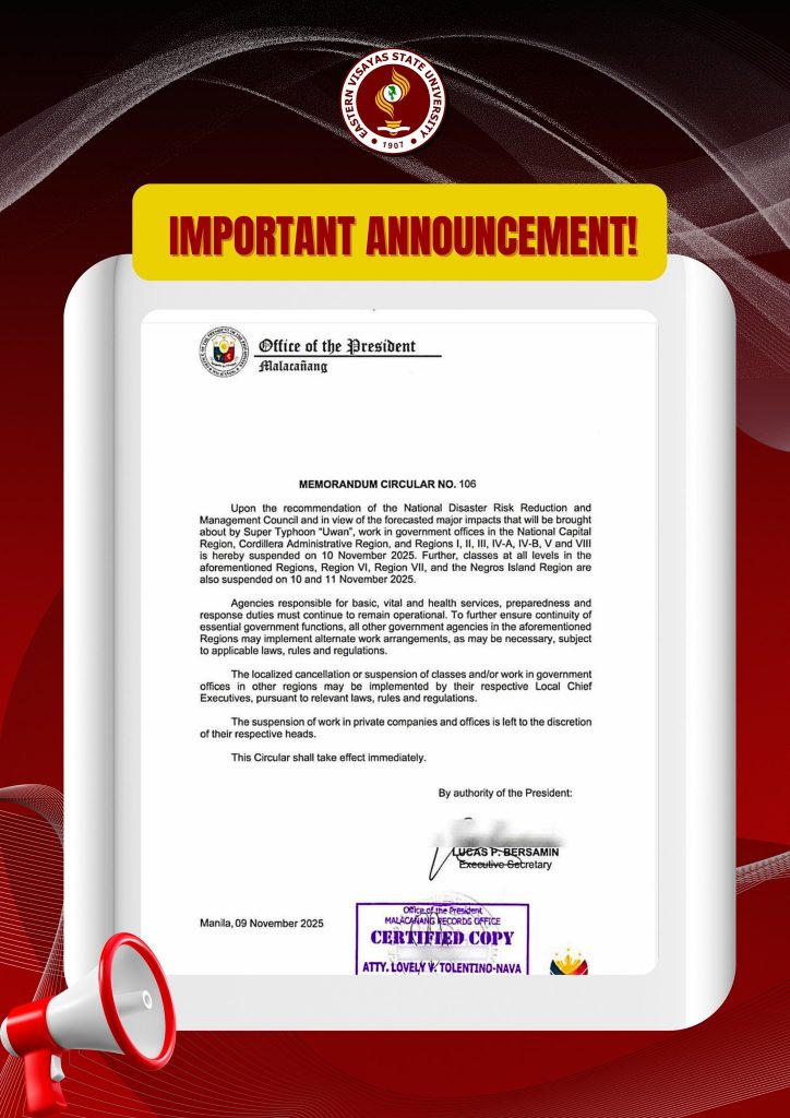 Memorandum Circular No. 106 issued by the Office of the President on November 09, 2025, announces the suspension of classes at all levels and work in government offices in regions affected by Super Typhoon “Uwan.”