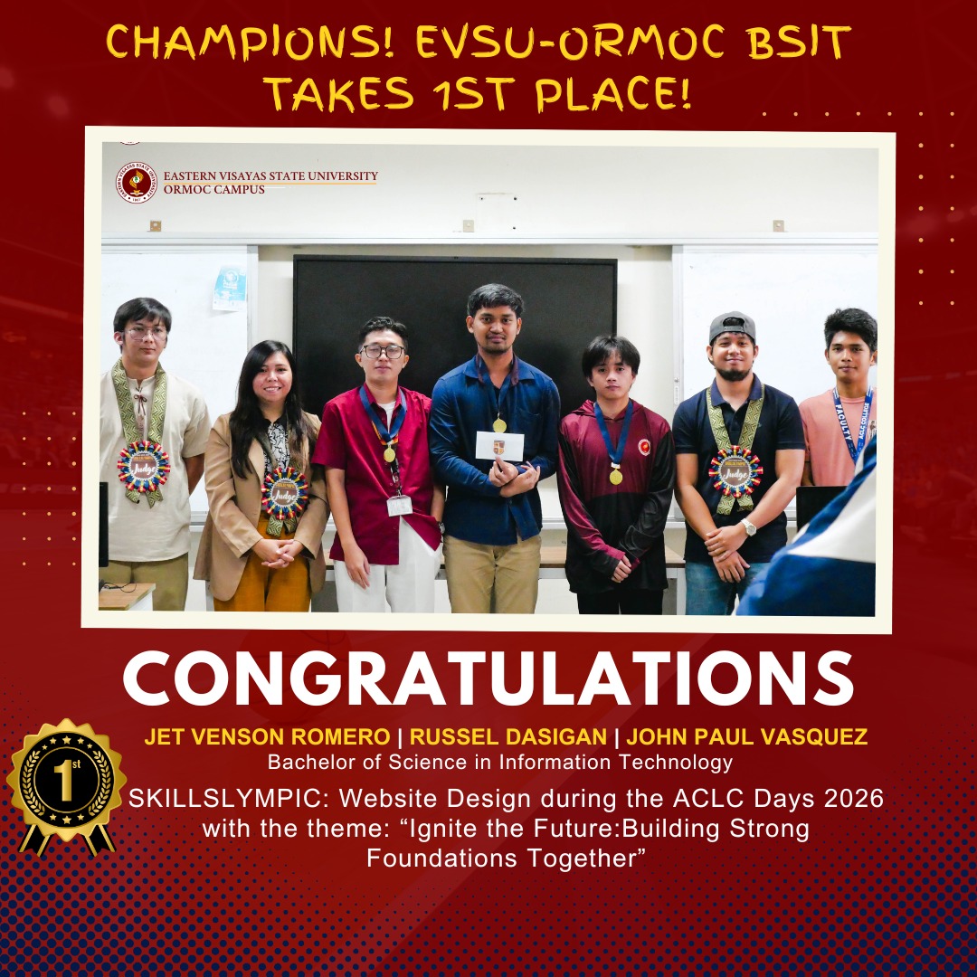 ORMOC CITY, LEYTE — Demonstrating technical mastery and creative innovation, students from the Bachelor of Science in Information Technology (BSIT) program of Eastern Visayas State University – Ormoc Campus (EVSU-OC) clinched 1st Place in the SKILLSLYMPIC: Website Design Competition held during ACLC Days 2026.